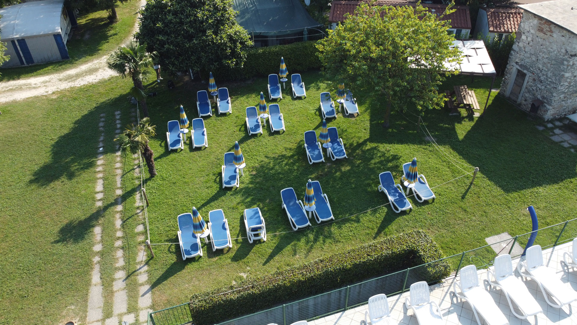 Das angrenzende Solarium ist mit Liegen und Sonnenschirmen ausgestattet, die auf einer grünen Wiese stehen, ideal, um sich bei einem kühlen Sommerdrink oder einem köstlichen Eis zu entspannen.